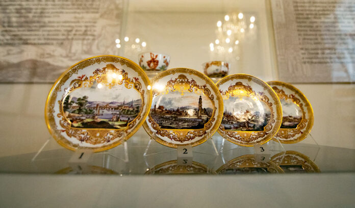 Inspiracja Dalekim Wschodem przeważała we wzornictwie miśnieńskiej manufaktury na początku lat 30. XVIII wieku. Później zaczęły się pojawiać motywy europejskie, najpierw kwiaty zaczerpnięte z atlasów botanicznych, a w okolicach 1735 roku pejzaże miast, czego przykładem jest wypożyczony z Muzeum Narodowego w Warszawie i prezentowany na wystawie, zestaw spodków z odwzorowanymi widokami Drezna, Zgorzelca, Kamienicy.