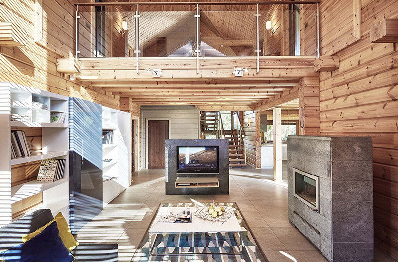 Jak się mieszka w domu z bali? Dzięki dużej ilości drewna we wnętrzu dom ma niepowtarzalny klimat i emanuje od niego ciepło. Czujemy się w nim bliżej natury, a duże przeszklenia jeszcze bardziej potęgują to odczucie. Skąd pomysł na sprowadzanie domu aż… z Finlandii? Jako nastolatkowie, podczas podróży po Skandynawii, widzieliśmy wiele takich domów, ale jeden szczególnie utkwił nam w pamięci. Ciepła barwa drewna, jego położenie oraz sposób, w jaki idealnie się komponował z otoczeniem ujęły nas i zapragnęliśmy kiedyś w takim zamieszkać. Po wielu latach przyszedł moment, gdy zdecydowaliśmy, że zbudujemy dom z bali, ale zapoznając się z ofertami polskich firm, nie trafiliśmy na nic, co byłoby spójne z naszymi założeniami. Zaczęliśmy poszerzać zakres poszukiwań o rynek skandynawski i tak trafiliśmy na Kontio. W których pomieszczeniach najbardziej lubią przebywać domownicy? Naszym ulubionym miejscem jest salon i w nim spędzamy wspólnie czas. Lubimy wpatrywać się w ścianę lasu, którego widok roztacza się z okien naszego salonu. Zimą cieszy nas ogień płonący w kominku, który również pochodzi z Finlandii i jest zbudowany ze steatytu, kamienia pozyskiwanego właśnie w tym kraju. Otwarta przestrzeń salonu na jadalnię i kuchnię sprawia, że te przestrzenie się wzajemnie przenikają i są miejscami, gdzie skupia się życie rodzinne. Do wszystkich pomieszczeń wpada duża ilość światła dziennego. Piętro lubimy za prywatność. Tutaj każdy ma swój pokój, a wspólną przestrzenią jest antresola. W jakim stylu urządziliście swój dom? Skoro pochodzi z Finlandii, to naturalnym dla nas wyborem było urządzenie go w stylu skandynawskim. Cenimy prostotę i dbałość o detale. Lubimy naturalne materiały, jak drewno i kamień, oraz jasne barwy. Ciepłe ściany drewna zostały złamane szarością i bielą, bo zależało nam na tym, aby podkreślić materiał, z jakiego powstał dom.