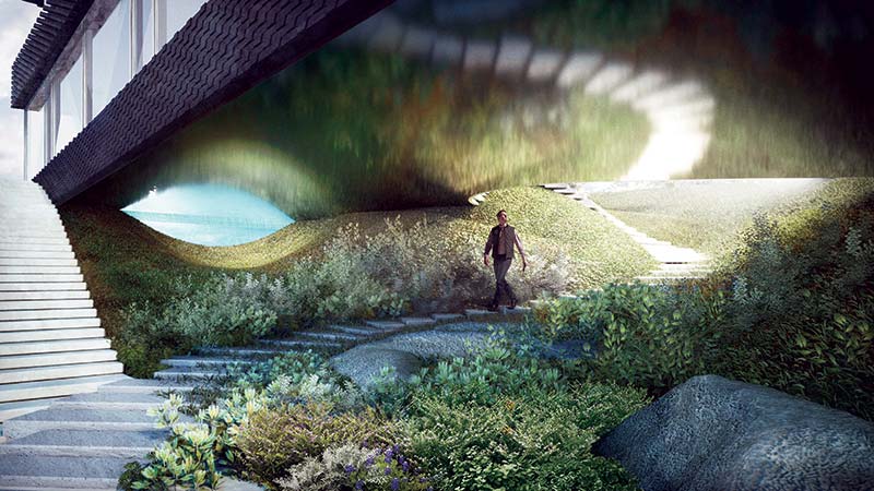 Dom powstanie na działce porośniętej paprociami, w bezpośrednim sąsiedztwie Lasu Wolskiego, nieopodal krakowskich Błoni i będzie posiadał widok na cały Kraków. W przestrzeni groty zlokalizowanej pod domem, odnajdziemy również surrealistyczne przeszklenie, które nazwaliśmy Smoczym Okiem. Łączy ono optycznie przestrzeń ogrodu i wewnętrznego domowego basenu zlokalizowanego w strefie dziennej. Jest to bajkowy, surrealistyczny świetlik odbijający się w lustrzanej płaszczyźnie podbitki, która multiplikuje efekt przestrzenny i wizualny tajemniczej leśnej groty.